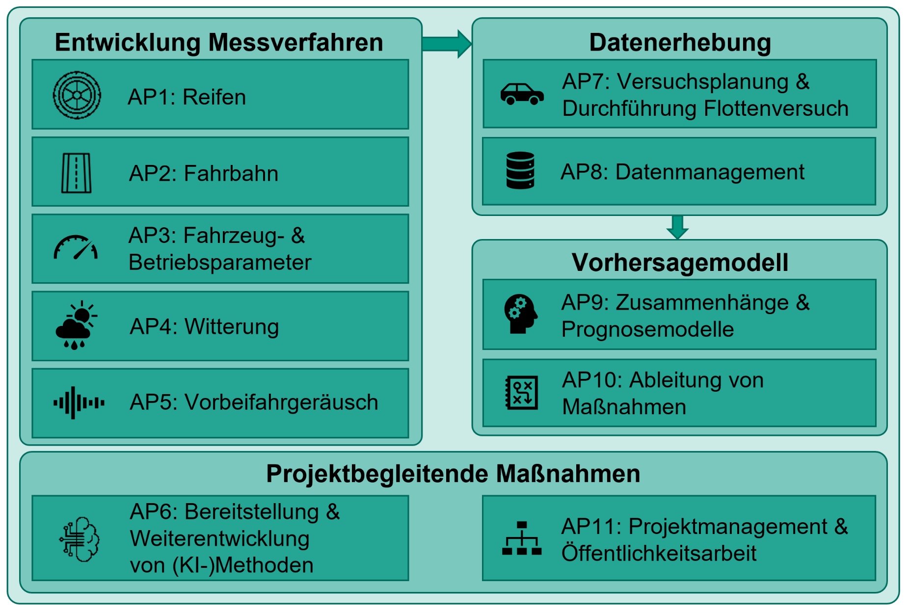 In AP9 wird zunächst die Qualität der Messdaten aus AP 1–5 und 7 überprüft und bei Bedarf korrigiert. Anschließend werden sowohl physikalische als auch datenbasierte Modelle zur Vorhersage des Reifen-Fahrbahn-Geräusches aufgebaut und miteinander kombiniert. Mit Hilfe dieser Modelle sollen dann neue Erkenntnisse über relevante Einflussgrößen auf das Reifen-Fahrbahn-Geräusch gewonnen werden. Die entwickelten Modelle und Verarbeitungsschritte sollen transparent veröffentlicht werden, so dass sie leicht nachgenutzt werden können.